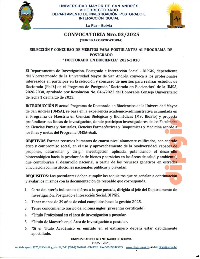 TERCERA CONVOCATORIA. SELECCIÓN Y CONCURSO DE MÉRITOS PARA POSTULANTES AL PROGRAMA DE POSTGRADO «DOCTORANDO EN BIOCIENCIA» 2026 – 2030 Publicación de la entrada:11 de diciembre de 2025 Categoría de la entrada:ASDI / CONVOCATORIAS / INVESTIGACIÓN Click aquí para descargar la convocatoria