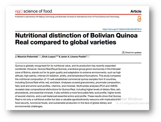 Un estudio publicado en la prestigiosa revista npj Science of Food (Springer Nature) revela que la quinoa real boliviana posee componentes nutricionales únicos que la diferencian significativamente de otras variedades cultivadas en el mundo, consolidándose como un recurso estratégico para la seguridad alimentaria global.